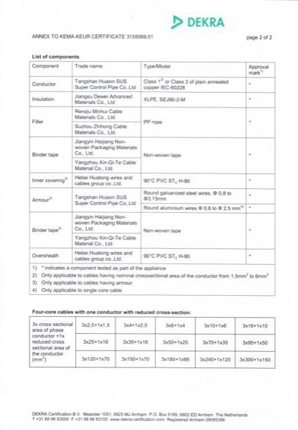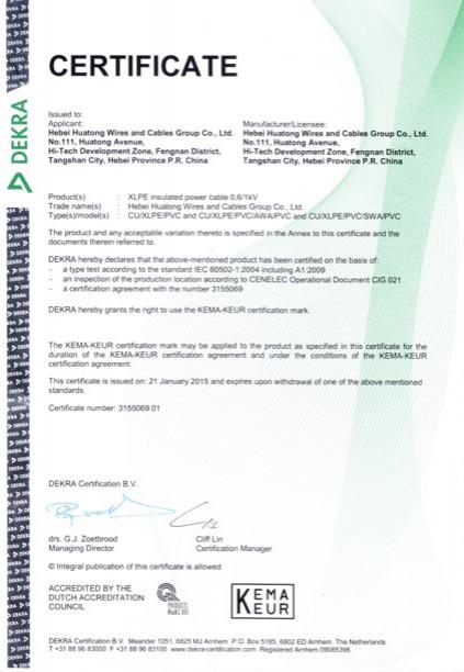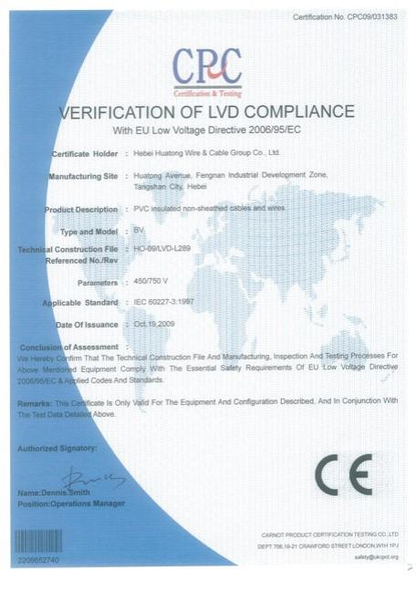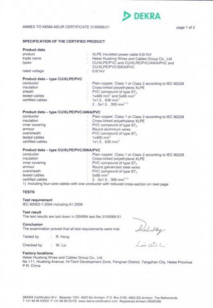 As a national accredited laboratory, Hebei Huatong Wires and Cables Group Co.,Ltd. not only has advanced production lines, it also is equipped with the leading domestic testing facilities. The combustion laboratory can conduct combustion test for bunched cables, fire resistant combustion test, mine cable load combustion test, vertical combustion test for single cable, which fully meets the combustion test requirements of IEC, BS and national standards. The oxygen index, halogen content, smoke density and carbon black content are determined accurately. Moreover, the Company is also equipped with a number of sophisticated testing equipment, such as Swiss AESA’s DC resistance measuring instrument, American Monsanto vulcanizer and the 77.5kV/750 kVA high voltage partial discharge detection device produced by American Hipo Company for factory inspection of incoming materials and products with the inspection rate of 100%. Well-trained and highly-qualified staff strictly control the process and use modern scientific and technological means to refine management, elaborate production and inspection.